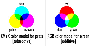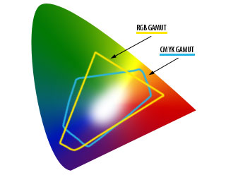 There are 2 things you should consider about the colors once printed. First, the colors will be darker than they appear on the screen. So even if darker colors seems more cool, always try to do something lighter than what you want. Else you could end up with some problem, especially if there is text. Second, colors will look more dull than on the screen. I found a picture on the net that attempts to illustrate the difference between both color models. It will give you an idea of the differences.