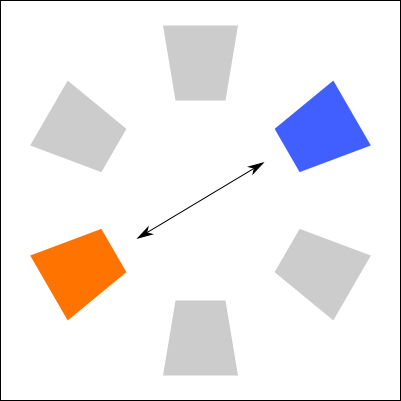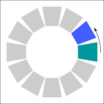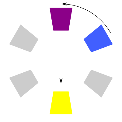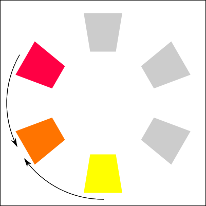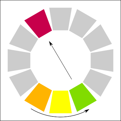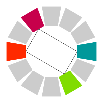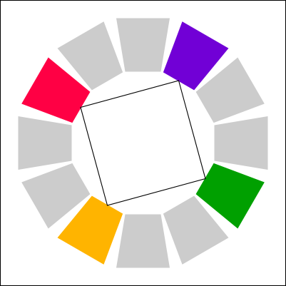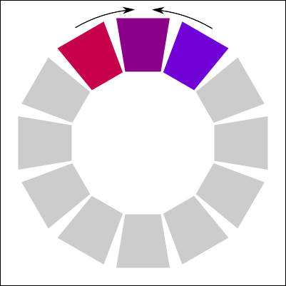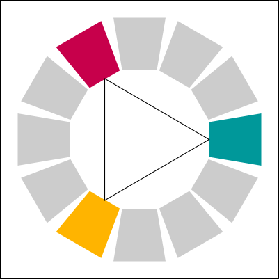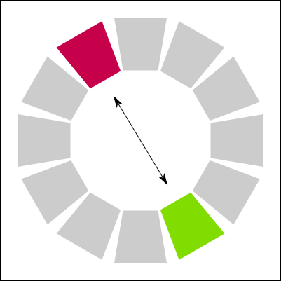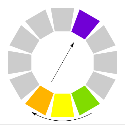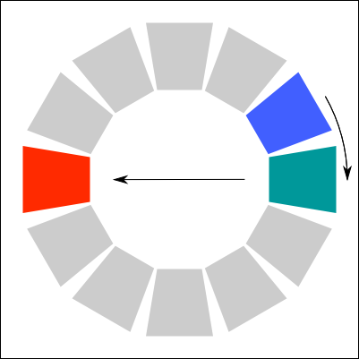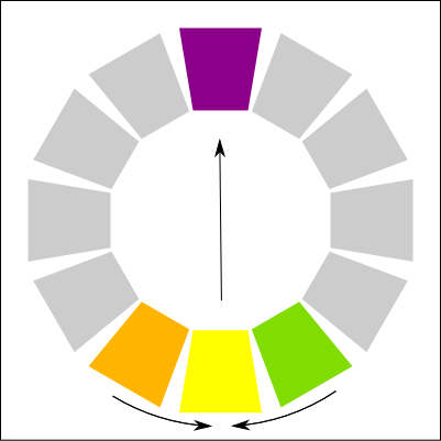 I stumbled on an interesting book that I cited above for the meaning of colors. There is an interesting section is about how to mix colors together. I decided to recreate a copy of each method here. In the color palettes below, it use the paint colors (CMY) and not the light colors (RGB). I am not sure if the same theory could be applied to an RGB palette. Else, you would need to convert the target color in RGB.