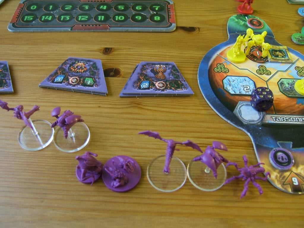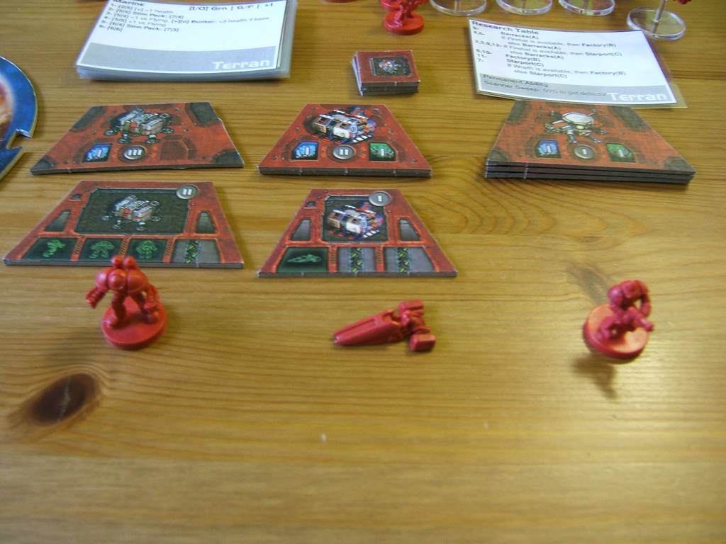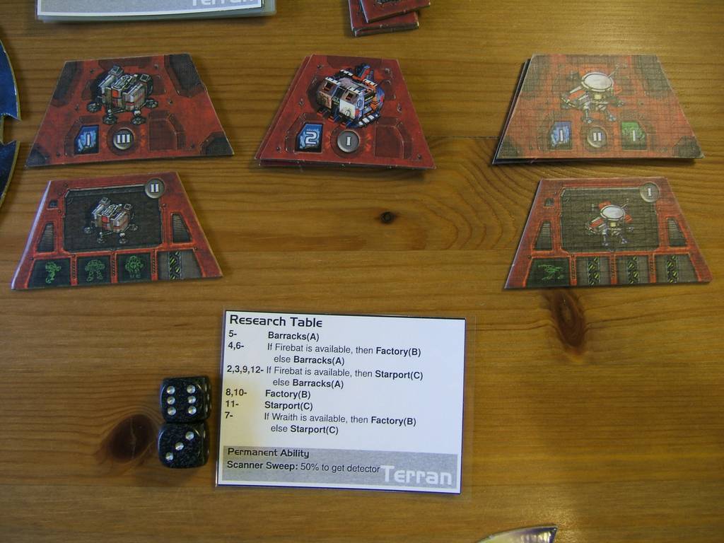 | When a research action is done, the AI will upgrade one of it's building. Each faction has a research table, roll 2 dice and see the result. In the illustration, the AI rolled 9, which leads to an entry that says "if firebats are available" (which is currently the case), "then build a space port". So the top space port building is flipped which now makes wraiths available. Else, a barrack would have been built. |  |