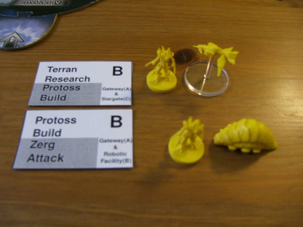 | Protoss only produce 2 units per action, the units produced are indicated by building names on the card. In the illustration, the top card says that building A and C are used, so a zealot and scout is placed into play. While the bottom card says that building A and B are used, so a zealot and reaver is produced. |  |
