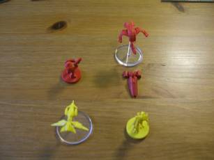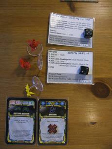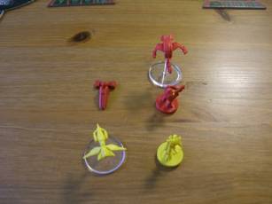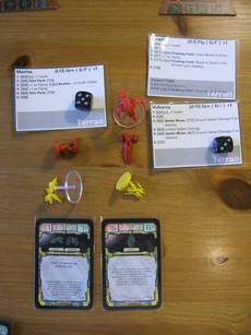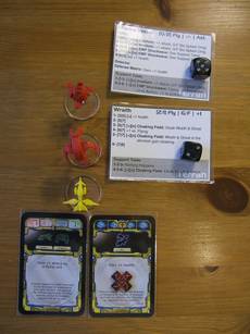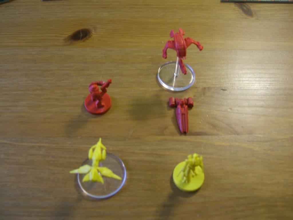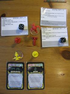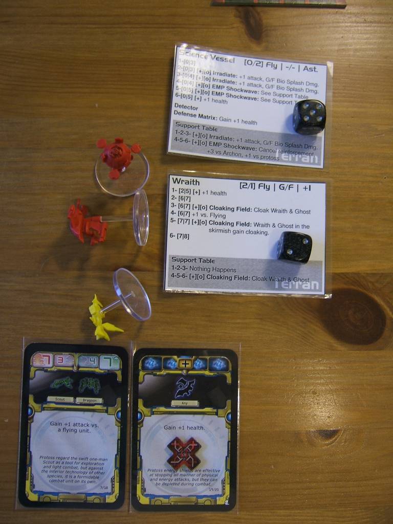 | Here is another example. Since the science vessel is an assit unit, it must be placed behind the wraith and it will roll a die for it's support table. The protoss player adds a reinforcement card to his scout to make sure it survives. |  |